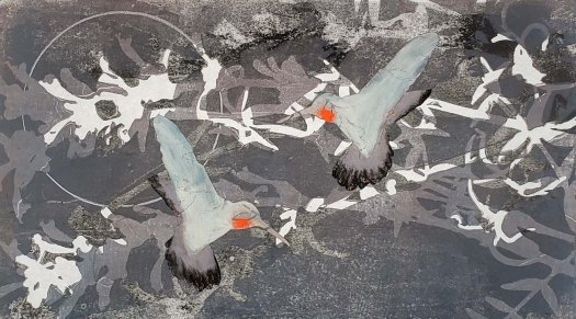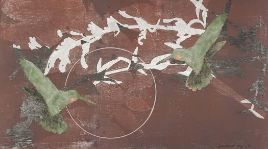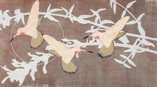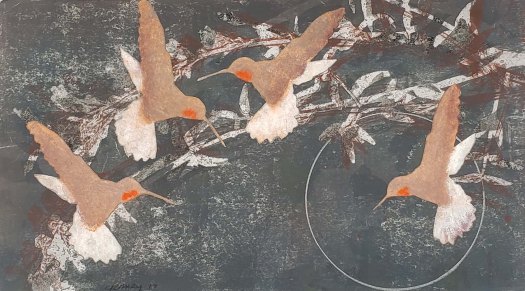 Midnight Hummingbirds is a series of 10 gelatin monotype collages. Archival rice paper, water based woodblock inks, pastel and Prismacolor pencil. Paper size 18 X 12 and image size 14 X 8. This series is based on the question of; How far can a living species go to adapt to change? 2019