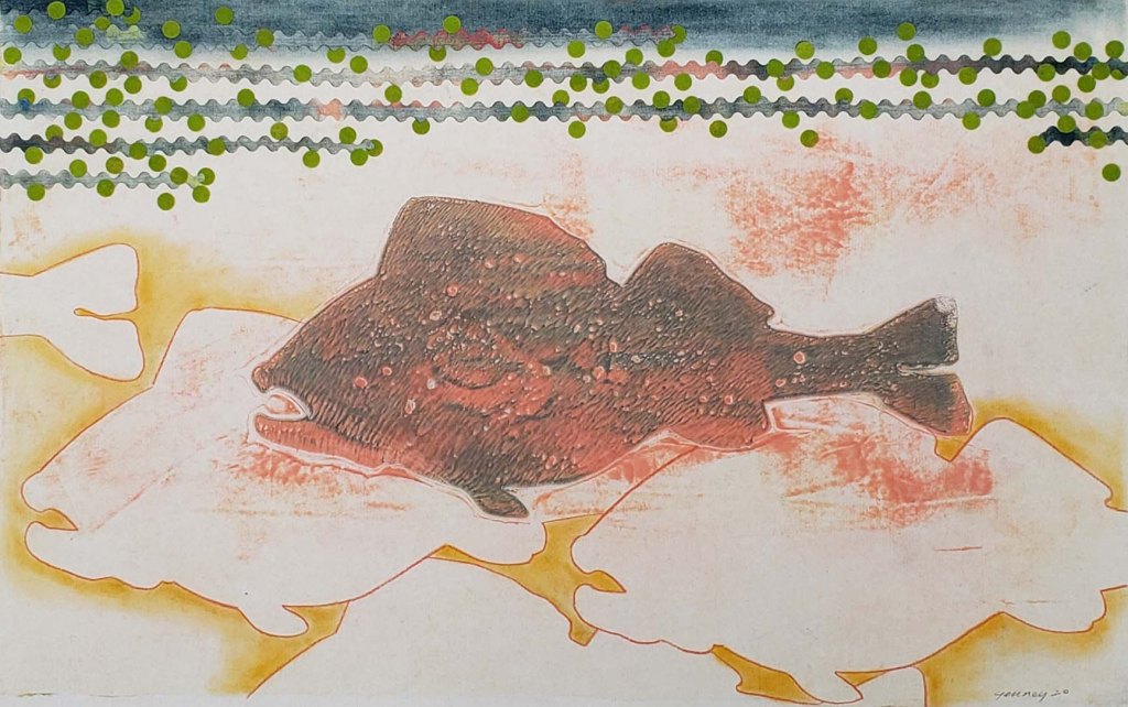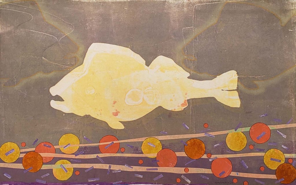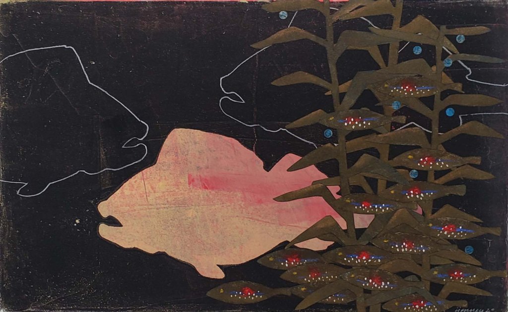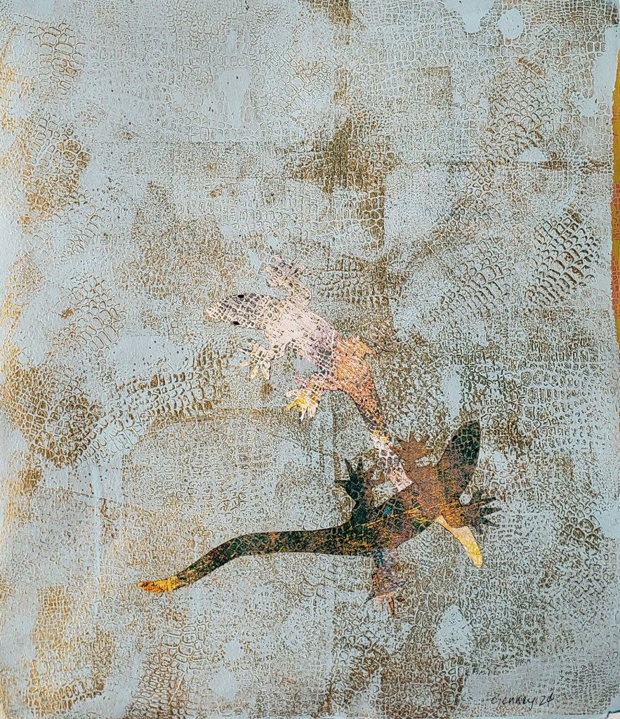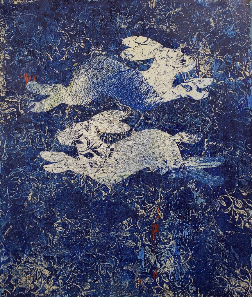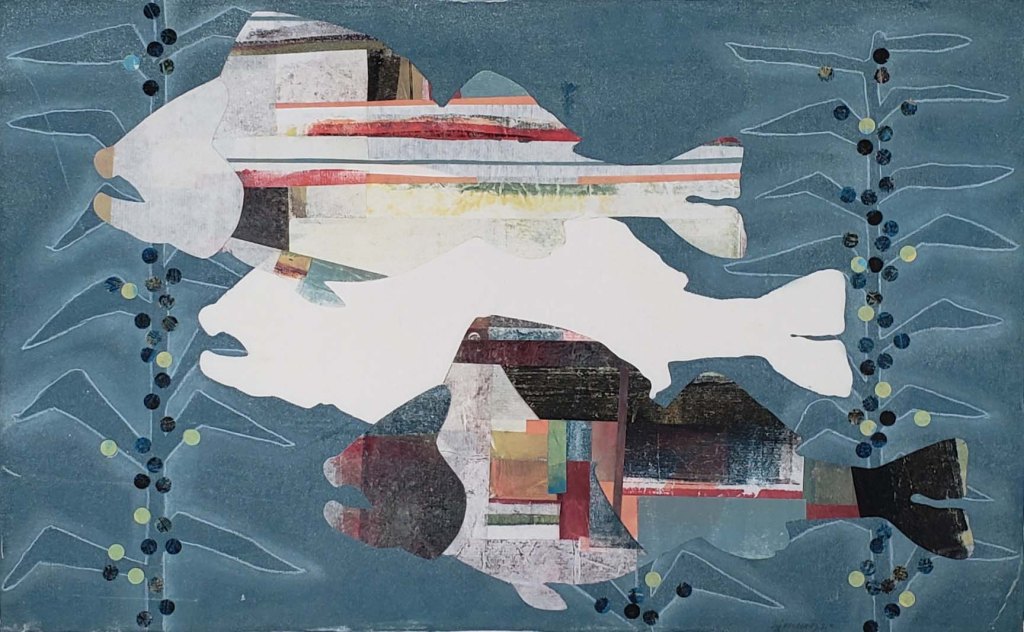 Ghost Fish is a series of 10 gelatin monotype collages. Sometimes we assume that just because we don’t actually see something, it still must exist – right? Water based ink on Chinese tang paper, pastel and Prismacolor pencil. Paper size is 18 X 12 and image size is 16 X 10. 2020
