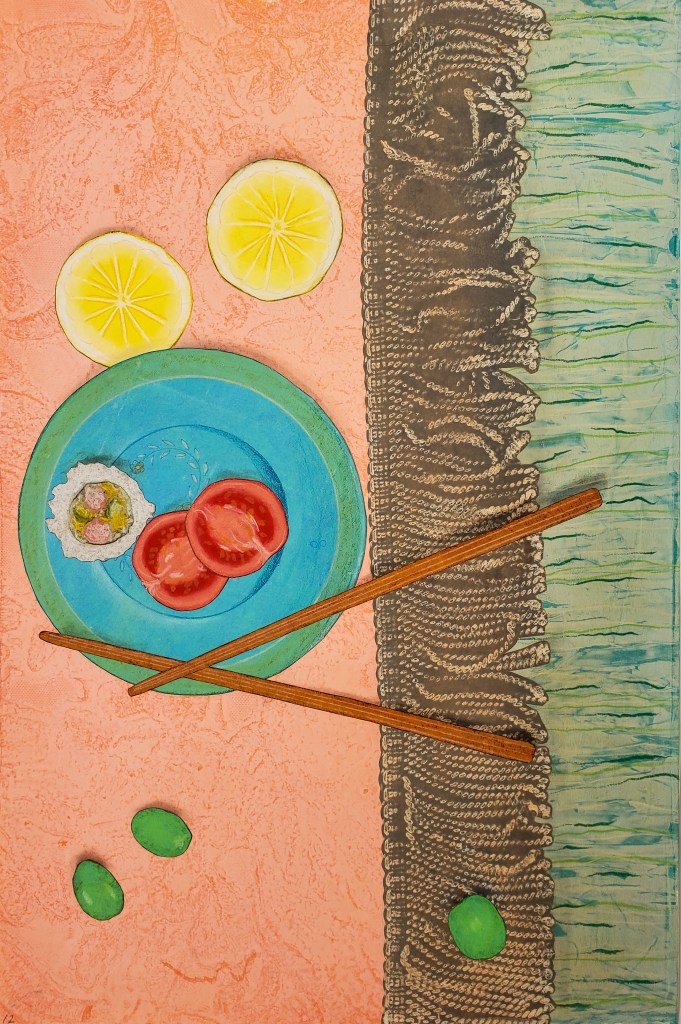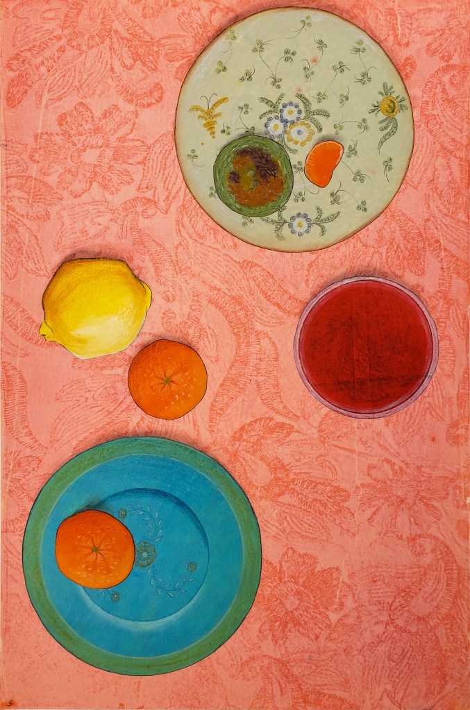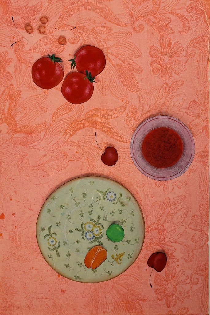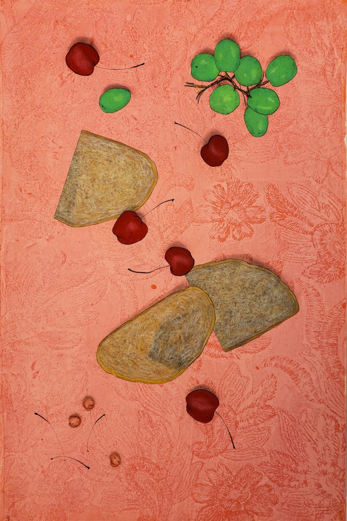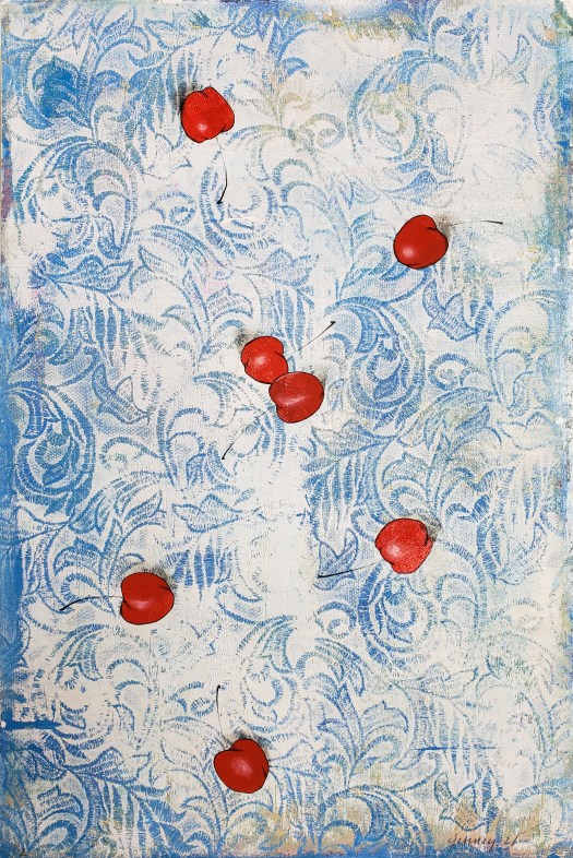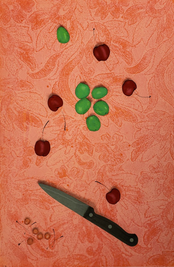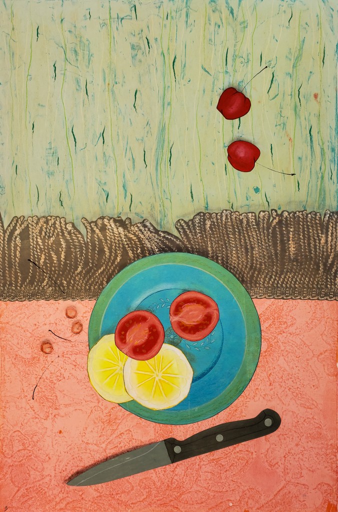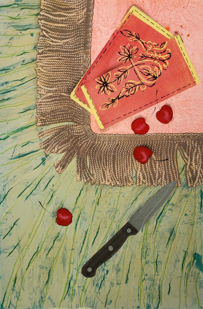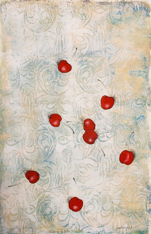 Cherries is a series of 8 unique gelatin monotype collages. Paper size is 12 X 18. Chinese tang paper, water based wood block ink, pastel and Prismacolor pencil. 2021