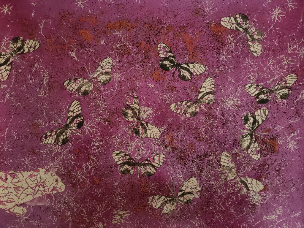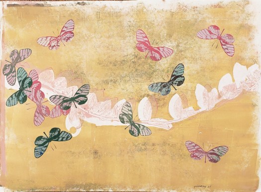 Longwings in Honeysuckle is a series of 8 individual gelatin monotype collages each measuring 18 X 24. Although not native to New Mexico, they are known to catch a warm breeze from Texas and visit. Water based wood block inks, pastel and Prismacolor pencil. 2021