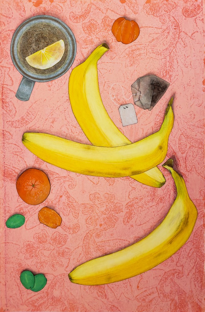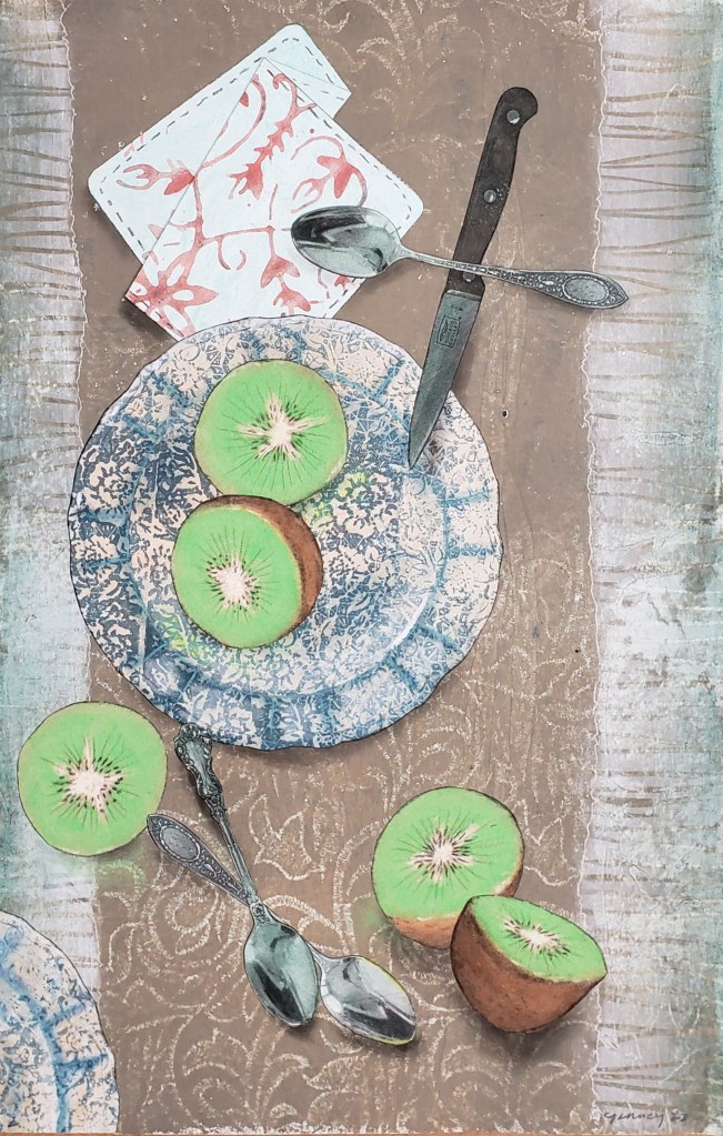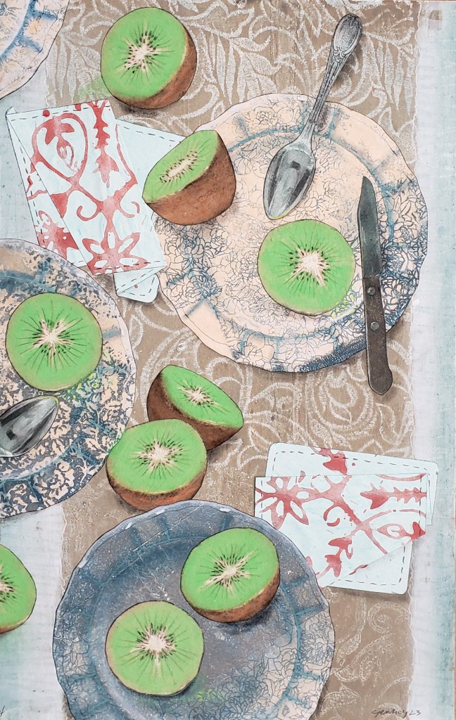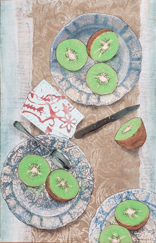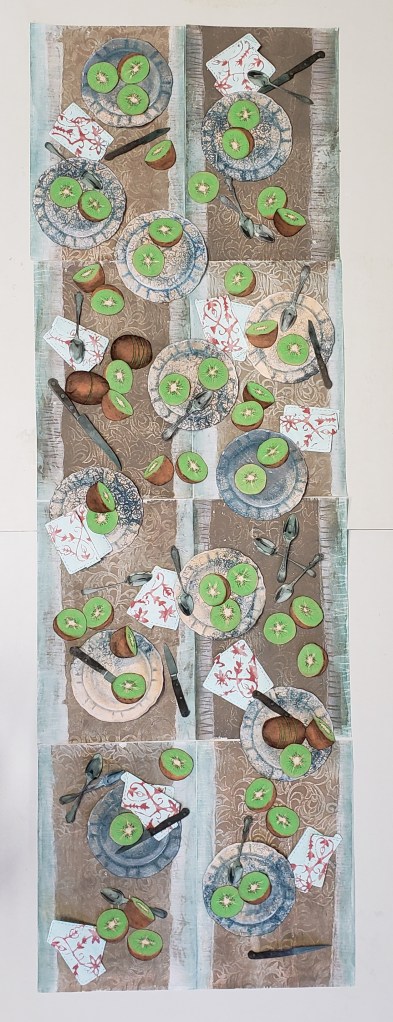 Kiwi is a gelatin monotype collage. Each piece is 11 X 17 inches and when fully assembled measures 22 X 68 inches. Water based block printing ink, pastel, Prismacolor pencil, laser prints, graphite on commercial paper with Chinese tang paper. 2023