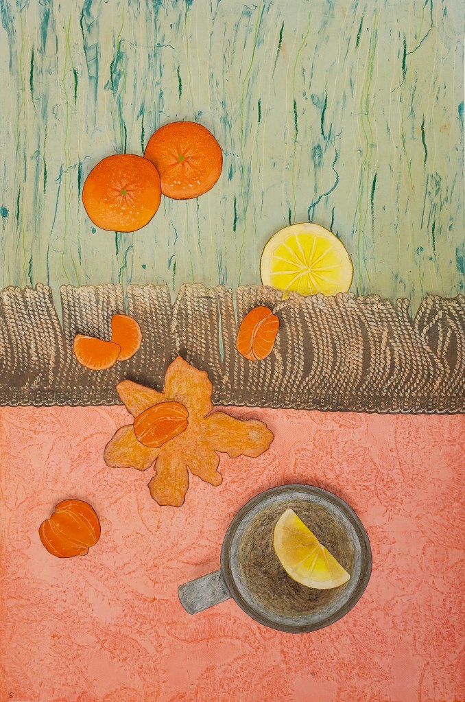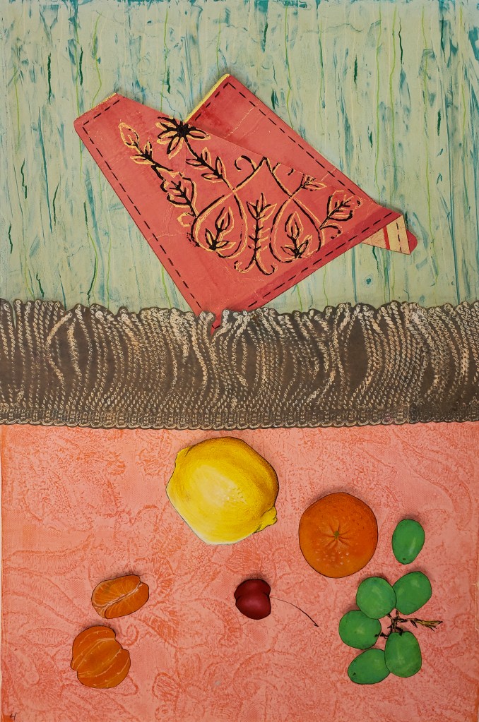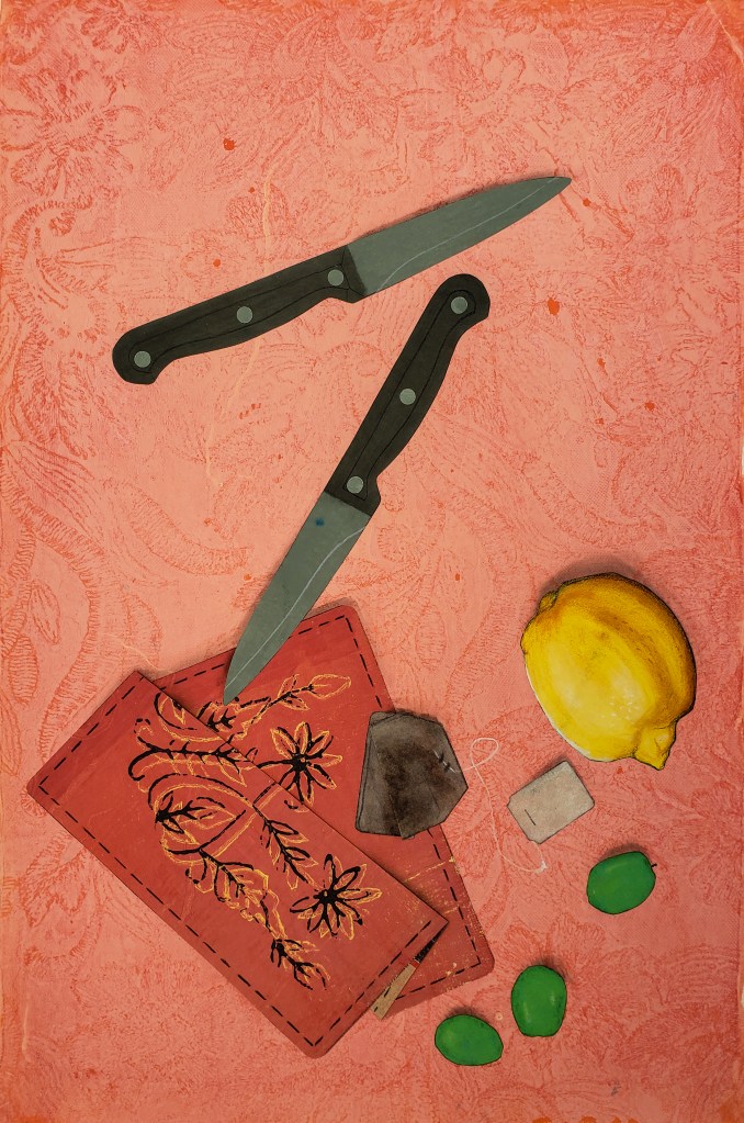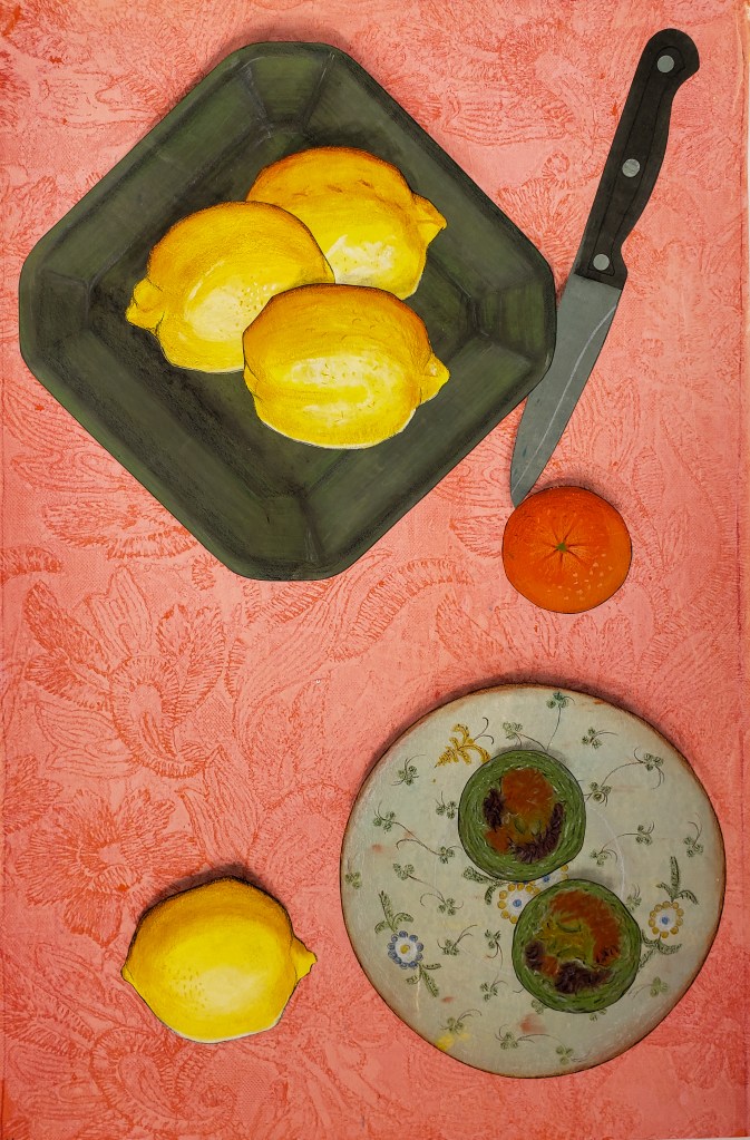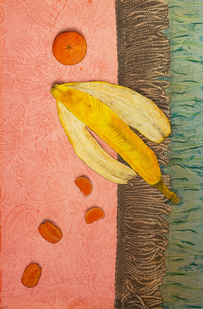 Kiwi is a gelatin monotype collage. Each piece is 11 X 17 inches and when fully assembled measures 22 X 68 inches. Water based block printing ink, pastel, Prismacolor pencil, laser prints, graphite on commercial paper with Chinese tang paper. 2023