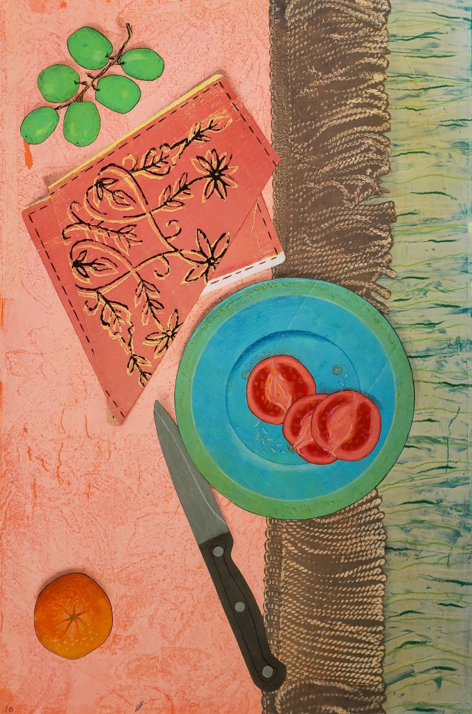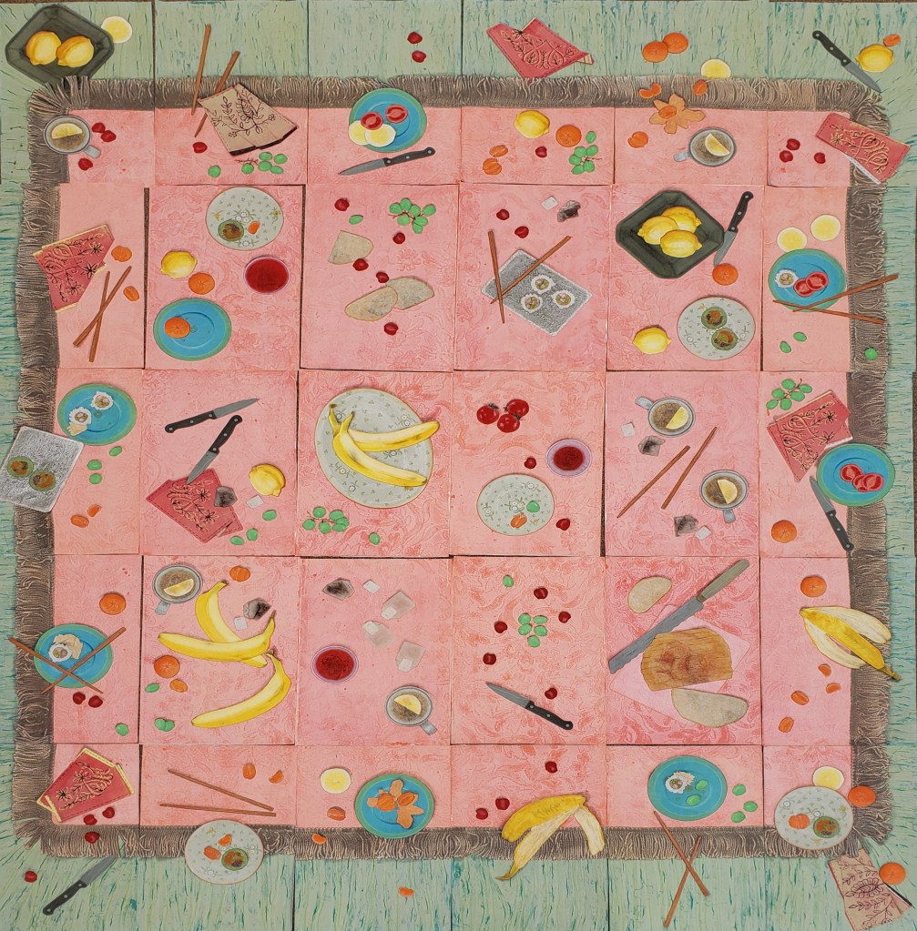 Picnic is a gelatin monotype collage. The image is of a large fringed tablecloth spread out on a lawn. It is covered in all the assorted things you might bring to a picnic, or perhaps all the random things that those attending might bring. The individual pieces reflect perhaps different memories of a shared event. What we see, what we do and what we remember of an experience is always unique and private. Each piece is 12 X 18 inches and there are 30 total. Spread out side by side the overall piece is 6.5 X 7 feet. Larger, of course, when framed. 2021