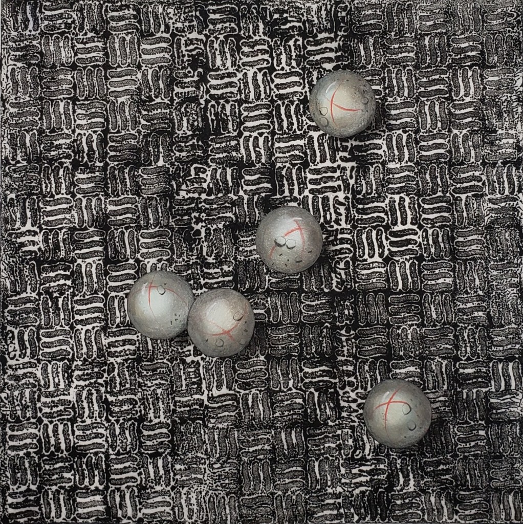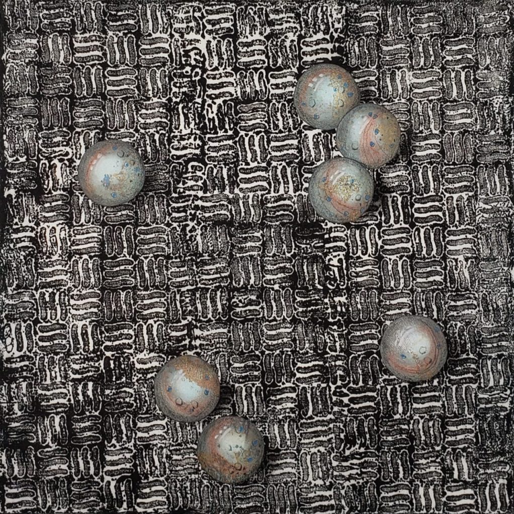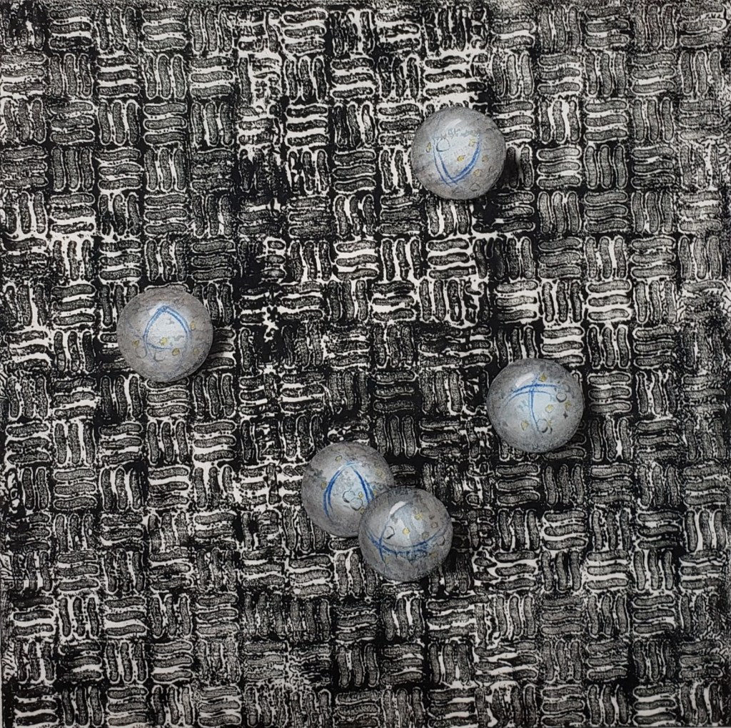 Spheres is a series of 7 individually unique images based on the idea that matter in space translates from the very small to the infinitely large. Akua inks on a Chinese tang paper with Prismacolor pencil, pastel and graphite, they measure 8 X 8 inches. Intaglio and collage 2024.