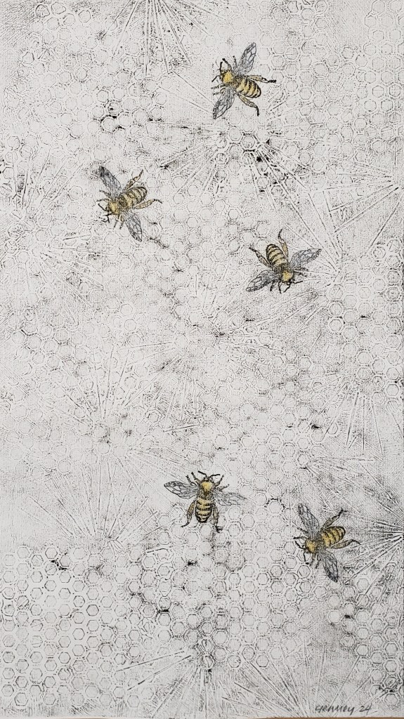 Bees in Cactus is a collection of 4 intaglio prints. They all measure 8 X 14 inches and each is slightly different in tone, color value and design. Akua inks on Chinese tang paper with added stamping and pastel. 2024