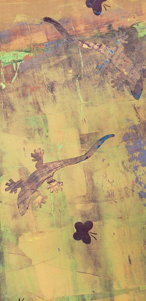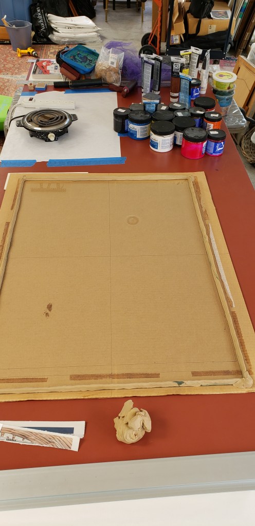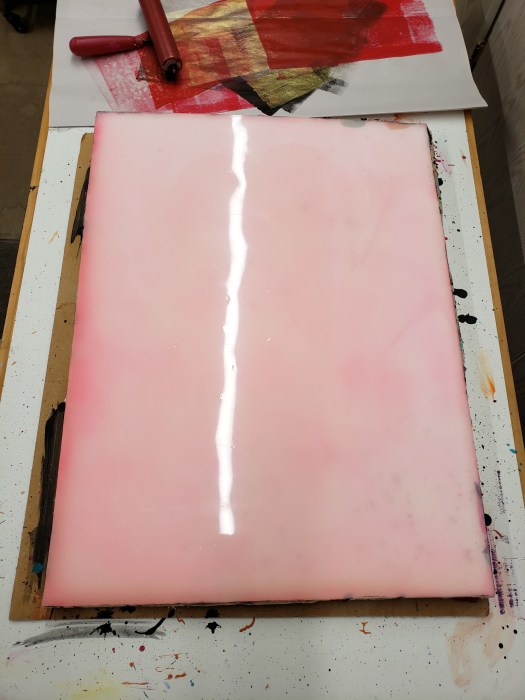 The beginning of any new printing session always begins with cutting the paper. This is a Beijie paper from Golden Panda. I have a roll of 10 sheets that measure 33 X 60 inches. I’m going to cut them to 24 X 33 which is relatively close to what my gelatin sheet will be.On a sheet of glass, I’ve pressed coils of oil clay to mark the edges of the gelatin sheet. When all the clay is secure and the edges reinforced, I cook up the gelatin and pour it into the mold.When the gelatin is set, I remove the oil clay and clean up the edges. Ready to roll on some ink and begin pulling prints. My papers are to my right and my color pallet is to my left.This is the back of my paper on the inked sheet of gelatin, ready to be pulled off. When dry I can pull repeated prints on the same sheet, building up layers of color.This is a detail of one of the “lizard and moth” series I am currently working on. It is a gelatin monotype collage.