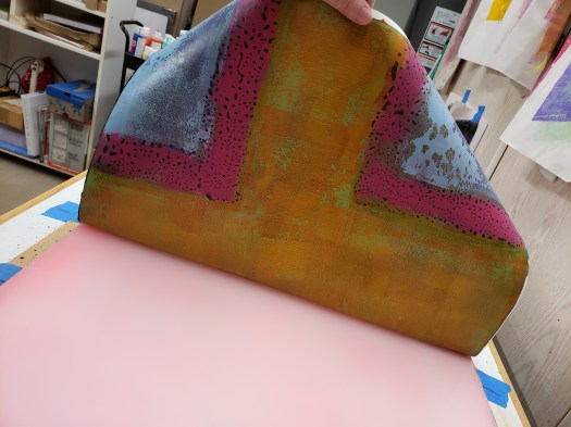 For my most recent body of work, I’ve been using using a silicone sheet which I made 18 X 24 inches. Using a brayer and texture plates, I apply layers of colors and shapes. Some transparent, some opaque. After every layer is completely dry, another layer can be applied. This is the beauty of acrylic paint. It all adheres. When I’m done adding layers, I apply a heavy final layer of acrylic and immediately cover it with the paper. On this image I’ve used carbon black because it makes a nice contrast with the color palate I’ve chosen. The paper needs to be completely dry before I can pull the image. Pulling the image. I’ve used an 18 X 24 inch sheet of sumi rice paper for this image because it adheres well and makes a clean pull off the silicone sheet. This is the final image once I’ve added in some collage elements and more acrylic details.